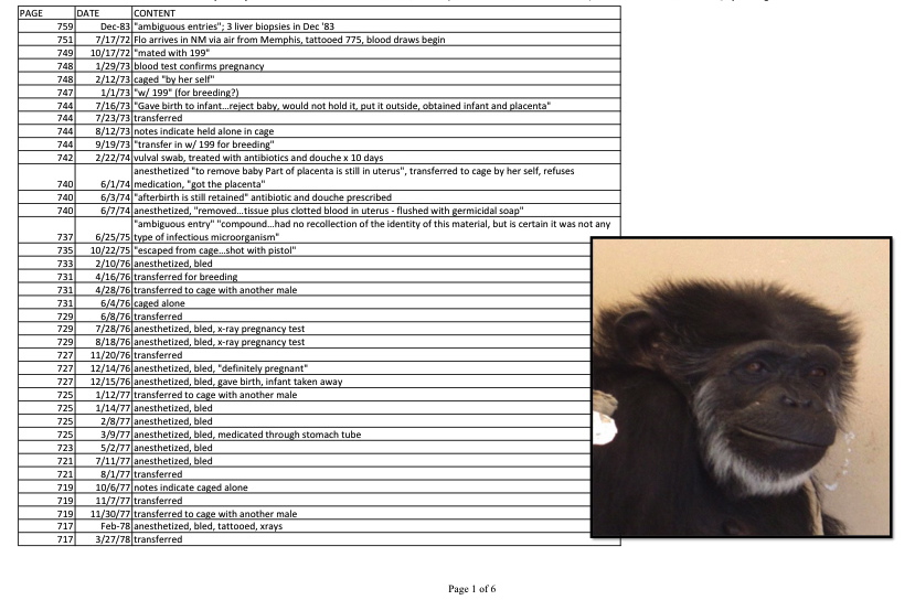 One of the chimps slated for transfer is Flo, currently the eldest surviving chimp in the Alamogordo colony. Flo was acquired from a zoo in Memphis, Tennessee in 1972. Her records (partial notes focusing on potential traumatic or stressful events, received via Freedom of Information Act) hint at what she has been subjected to over the years.