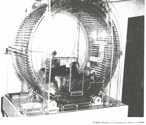 Monkey on radiation wheel at the Armed Forces Radiobiology Research Institute, 1979.