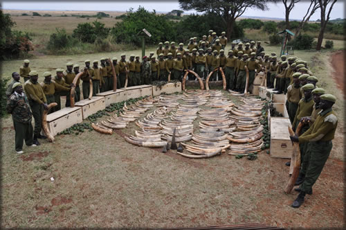 KWS rangers and officers display ivory seized at the Jommo Kenyatta International Airport. The cargo was destined for Malaysia through Dubai by Emirates airline.