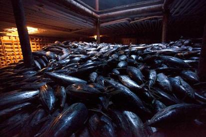 Tons of frozen skipjack tuna in the hold of the Heng Xing 1. (Photo: Courtesy of Shannon Service)