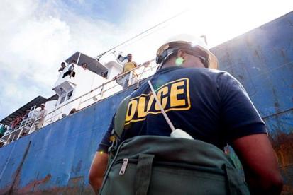 Palau marine officer Earl Benhart prepares to board the Sal 19, a fishing vessel transiting through Palauan waters. The Sal 19 was one of the three boats caught unlawfully moving tuna. (Photo: Shannon Service)