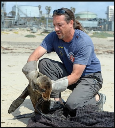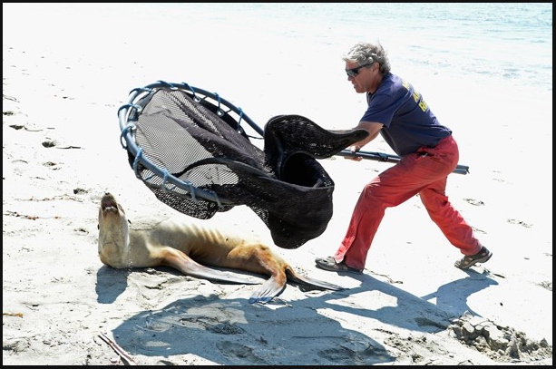 Starving sea lion is rescued by Peter Wallerstein, the Marine Animal Rescue director for Friends for Animals. (Photo: Kevork Djansezian/Getty Images).