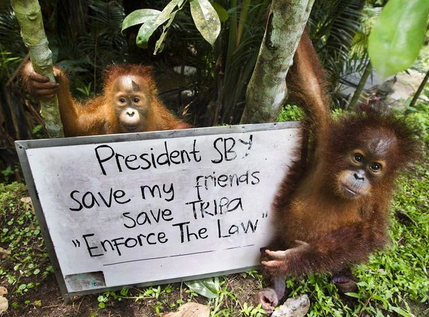 Confiscated illegal pet orangutans being cared for by the SOCP team, join with people around the world calling on “President Susilo Bambang Yudhoyono to save their friends, save Tripa and to Enforce the Law.”