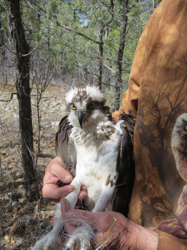 US Fish and Wildlife Migratory Bird specialist Bob Murphy and friend Dale Stahlecher, a wildlife biologist, were preparing for a canoe trip down the Rio Chama River, in New Mexico, when they spotted an Osprey dangling from a pine tree, 60 feet up.