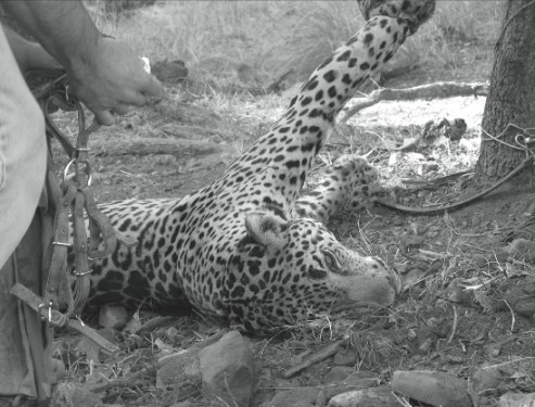 On February 18, 2009, AFG biologists found Macho B captured in a wire snare. The snare had been set by biologist Emil McCain, who was working as a subcontractor for the department capturing mountain lions and bears for radio-collaring. Ostensibly, snaring a jaguar was a happy accident. The biologists tranquilized, radio-collared and released the cat.