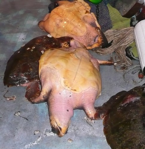 Dead sea turtles bycatch on-board a Baja gillnet vessel.