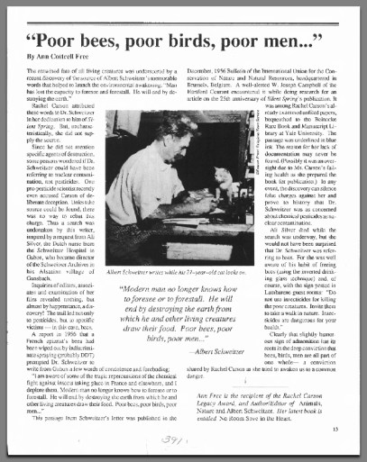 Upon learning of the destruction of a French apiarist’s honeybees due to indiscriminate spraying of new post World War ll chemical insecticides, Dr. Albert Schweitzer wrote to a bee keeper: