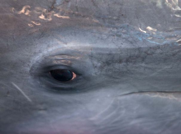 While a dolphin is examined, one researcher is told to watch its eye to make sure the mammal stays alert and interested in what’s going on as a way to monitor its vitals during the study. (Photo: Ted Jackson/The Times Picayune)