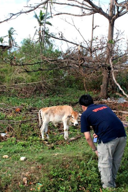 Prospera Bernal brought her 15-year-old buffalo for treatment. He was injured during the typhoon and had a gash on his back that had not healed and become infected. Although the injury would not normally be serious, the stress of the typhoon, lack of proper food and medicines and the hot, humid temperatures can turn relatively minor injuries into life-threatening conditions. The animal’s wound was disinfected and he was given vitamin injections to boost his immunity to disease.