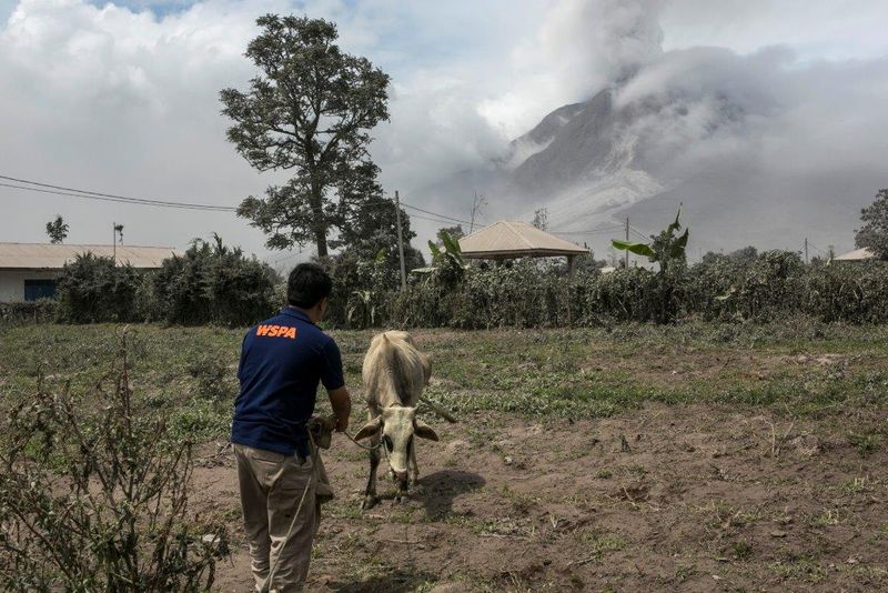 A team from the World Society for the Protection of Animals is on the slopes of Mount Sinabung in Northern Sumatra attending to hundreds of animals in the ash-covered wasteland surrounding the volcano which recently came back to life after 400 years of inactivity.