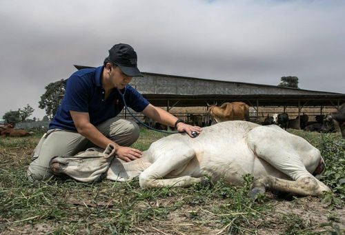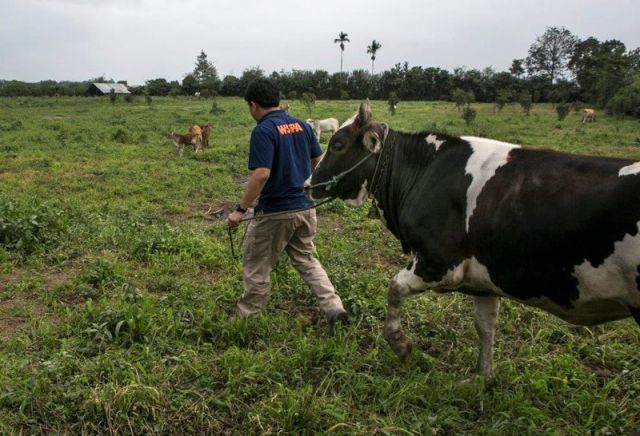 Approachding a cow in the danger zone around Mt. Sinabung.