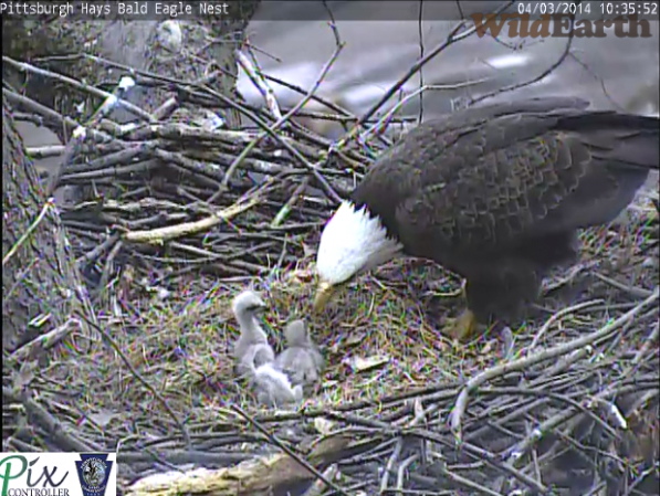 The parents feed the eaglets bits of fish and squirrel torn into tiny pieces.